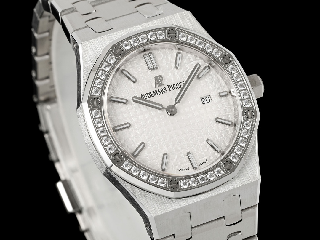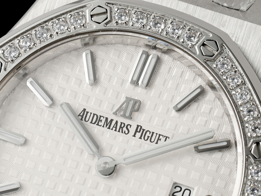 AUDEMARS PIGUET Royal Oak Series 67651OR Ladies' Quartz Watch ~ Shining debut! Goddess versatile style, sparkling and charming! The genuine product purchased through the APP is disassembled and mold-made. The entire process is CNC polished, and the pattern is checked and adjusted multiple times, with distinct edges and corners. The case diameter is 33MM. The multi-faceted bezel precisely fits the case. The bezel is fixed to the case with hexagonal screws (the bezel opening is set with exquisite Swarovski diamonds, dazzling and brilliant). The bracelet links are exquisitely and neatly arranged. The links have undergone hundreds of meticulous polishing processes, presenting a perfect texture. The folding clasp is easy to open and close and convenient to wear. The lugs of the watch are curved, which can ensure a better fit between the watch and the wrist. The dial is engraved with the "Grande Tapisserie" large checkered pattern decoration, paired with fluorescent three-dimensional hour markers and Royal oak hands. The wide hands and hour markers make reading the time simple and clear. The date display window at the three o 'clock position is shown in Arabic numerals. The wristwatch has a sealed case back, on which the English name of the Royal Oak series, "Royal Oak", is engraved. It is equipped with a Swiss F04111 quartz movement inside. Accurate timekeeping! APP production, making goddesses also very royal!