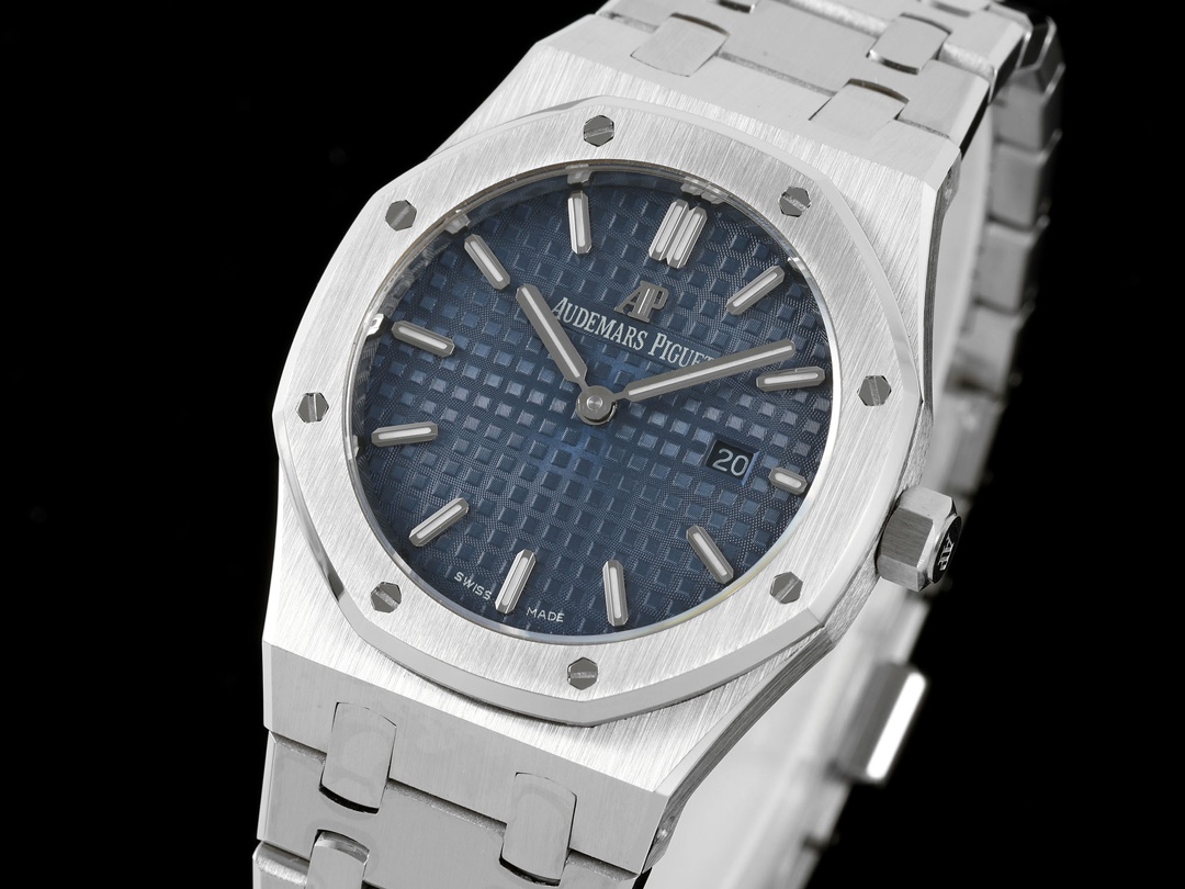 AUDEMARS PIGUET Royal Oak Series 67651OR Ladies' Quartz Watch ~ Shining debut! Goddess versatile style, sparkling and charming! The genuine product purchased through the APP is disassembled and mold-made. The entire process is CNC polished, and the pattern is checked and adjusted multiple times, with distinct edges and corners. The case diameter is 33MM. The multi-faceted bezel precisely fits the case. The bezel is fixed to the case with hexagonal screws (the bezel opening is set with exquisite Swarovski diamonds, dazzling and brilliant). The bracelet links are exquisitely and neatly arranged. The links have undergone hundreds of meticulous polishing processes, presenting a perfect texture. The folding clasp is easy to open and close and convenient to wear. The lugs of the watch are curved, which can ensure a better fit between the watch and the wrist. The dial is engraved with the "Grande Tapisserie" large checkered pattern decoration, paired with fluorescent three-dimensional hour markers and Royal oak hands. The wide hands and hour markers make reading the time simple and clear. The date display window at the three o 'clock position is shown in Arabic numerals. The wristwatch has a sealed case back, on which the English name of the Royal Oak series, "Royal Oak", is engraved. It is equipped with a Swiss F04111 quartz movement inside. Accurate timekeeping! APP production, making goddesses also very royal!