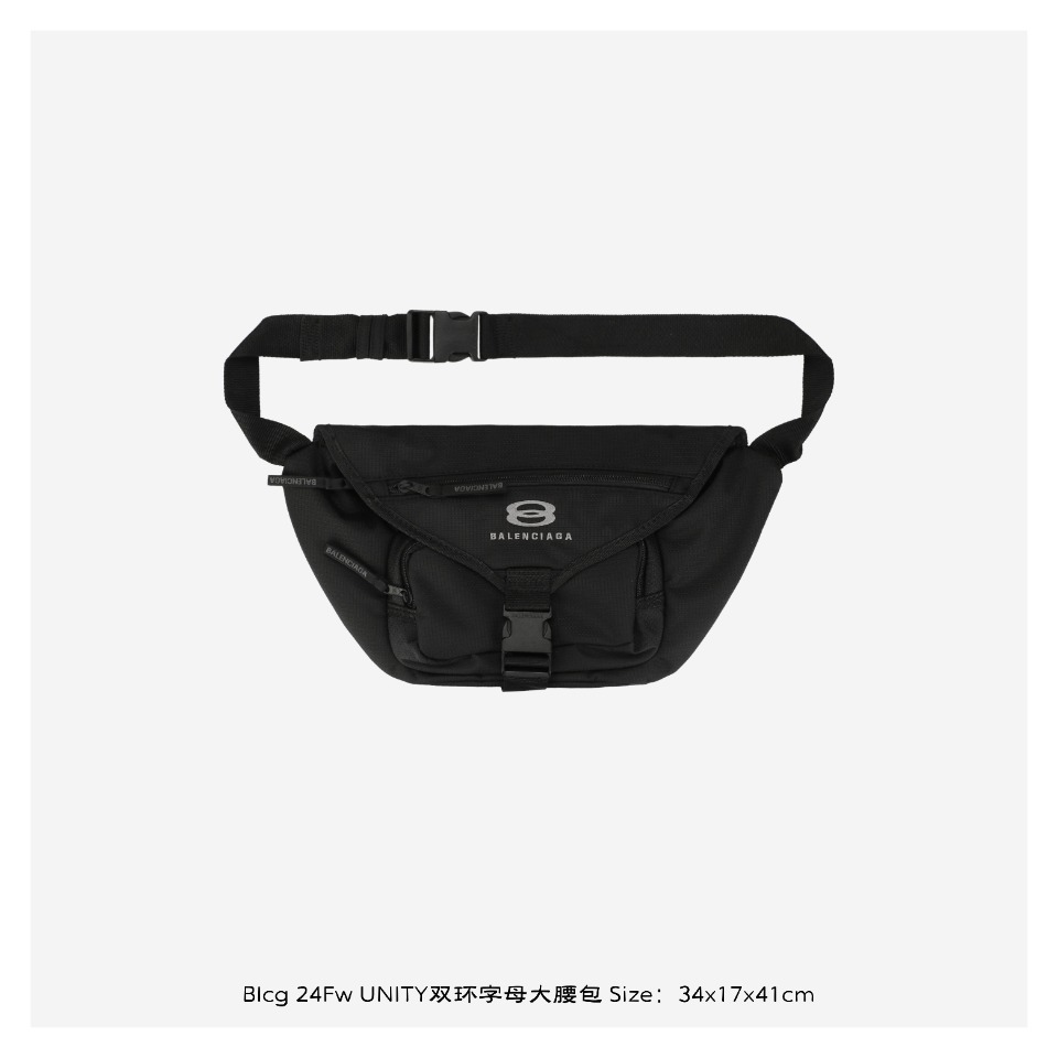 Balenciaga/ Balenciaga 24Fw UNITY Double Ring Letter Large waist bag The original 9200 was purchased. The fabric was disassembled and analyzed immediately. It uses a custom-made renewable short-fiber nylon check fabric of the Nissan brand. The hand feel is more resilient than that of ordinary nylon fabric, with extremely high tightness. It has undergone 10,000 opening and closing tests and has strong tear resistance. It has been treated with fluorine-free DWR and is water-resistant. It can hold items such as mobile phones, wallets, and cards. YKK zipper pull head hardware, a specific brand that meets the needs of daily life, is the Hermes of the zipper industry. It features custom three-inch jacquard Logo webling, exclusive mold buckles, laser-engraved logos, imported Takeshio machine embroidery, tight and full stitches, perfect reproduction, Spacermesh soft cushion back width for comfort and ventilation, lightweight and durable, with diverse functions, suitable for daily matching and outdoor use Size: 34x17x41cm