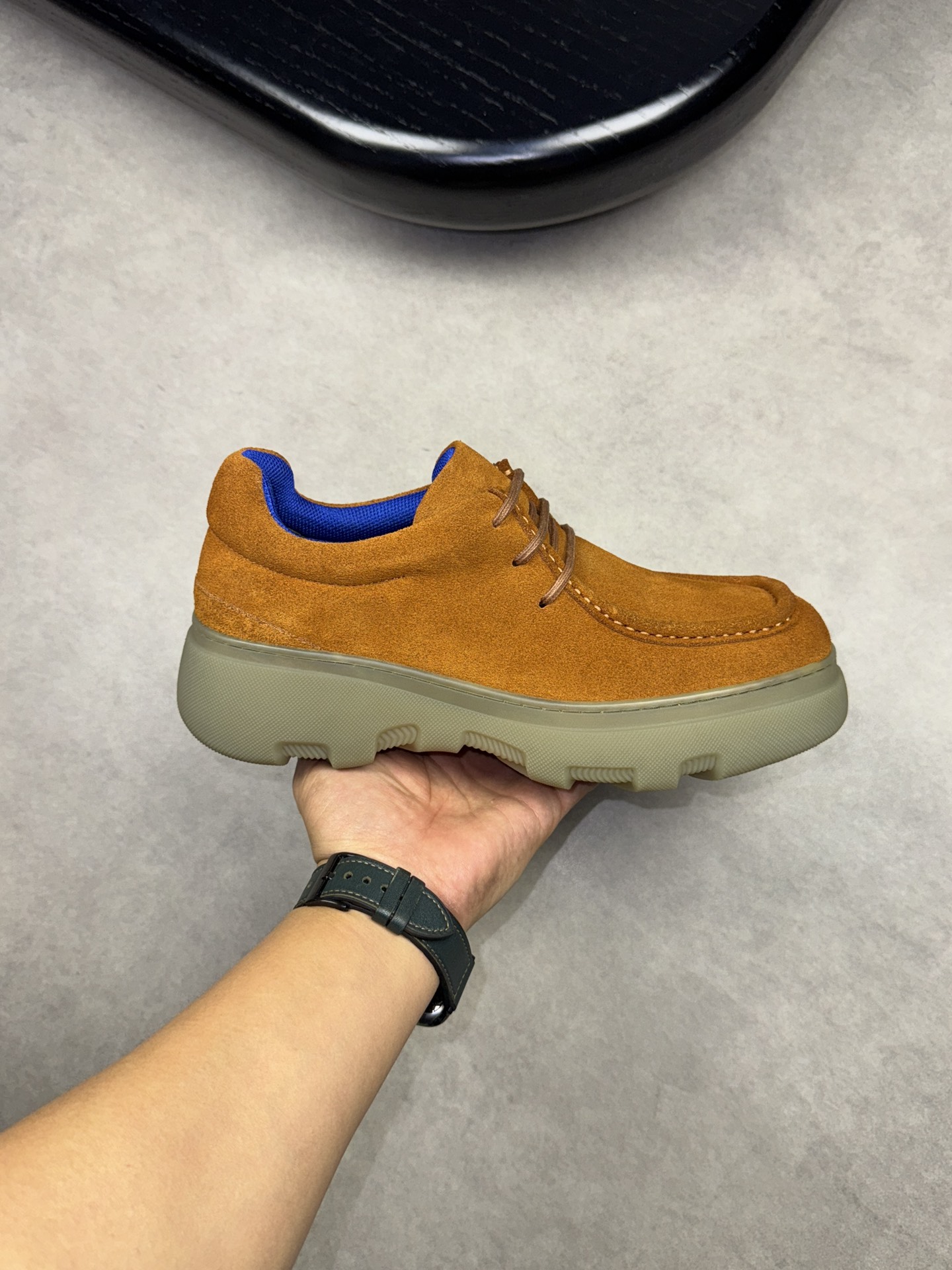 - Upper: ?? fleece calfskin with hand-stitched marking