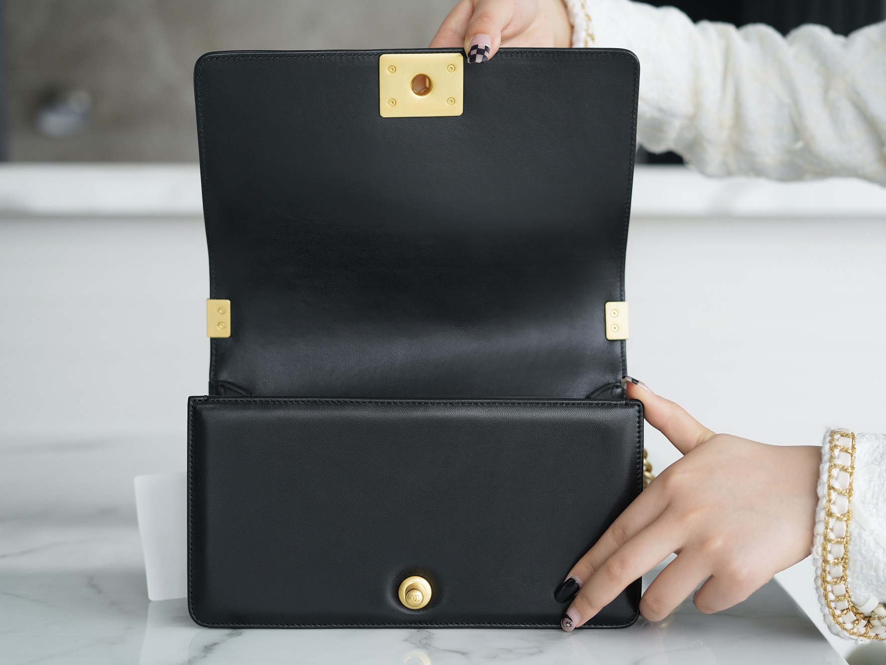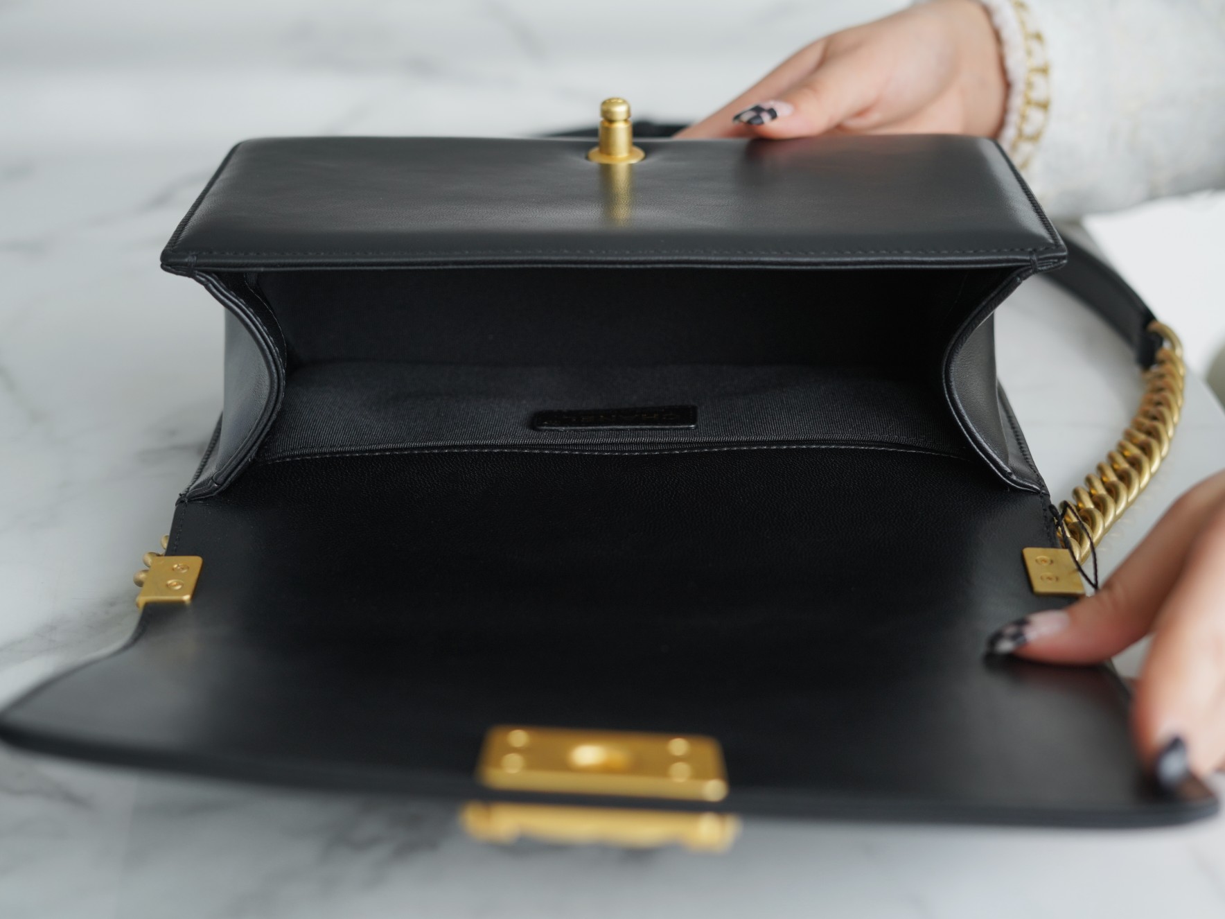 ???????????? ?????????? Lambskin black gold medium size ?? French ???? lambskin, with fine and natural grain, fine leather and transparent underbody, very feminine. The design inspiration originated from the hunting bullet magazine carried on the back of the founder Gabriell&e Chan&e*, and was named after "Boy Capel", the lifelong love of Gabrielle Chan&e. It is precisely the symbol of neutrality, handsomeness, bravery and straightforwardness Size: 25cm ?? : 670860521
