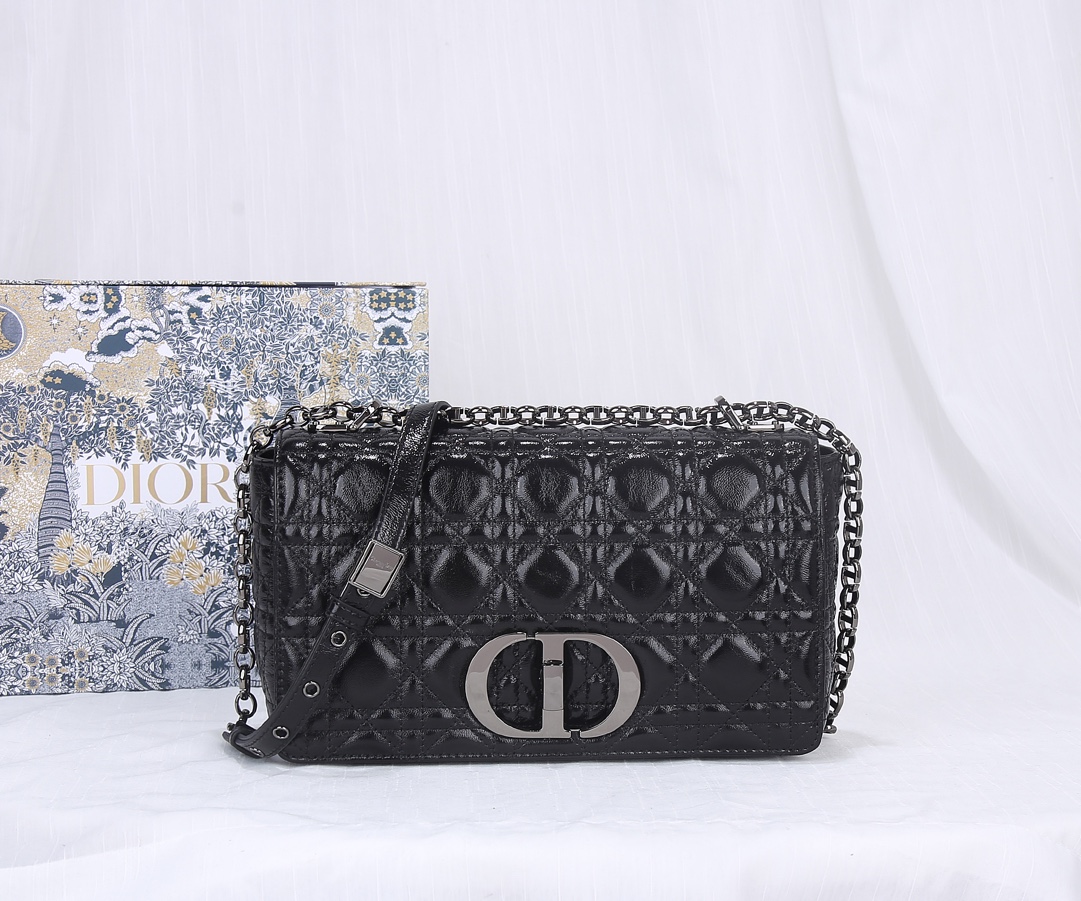 The new mid-sized crepe leather from Dior The Dior Caro handbag is elaborately crafted from black wrinkled leather and decorated with the signature rattan checkered stitches. The material is soft. The flip cover is decorated with a retro gold finish metal "CD" clasp, inspired by the seal of Christian Dior perfume bottles. The small-sized style comes with a detachable signature "CD" chain shoulder strap, which can also be replaced with an embroidered wide shoulder strap for a more elegant and fashionable look. Whether it's a daily look or a dinner party Dimensions: 25.5x15.5x8CM