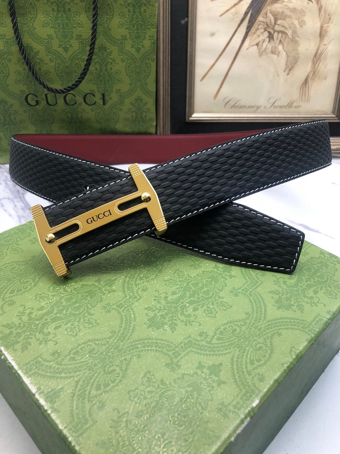 Gucci: Original single-grain calfskin with embossed patterns, lined with plain cowhide base, creating a woven appearance. Decorated with the original single buckle of the logo. The counter width is 4.0