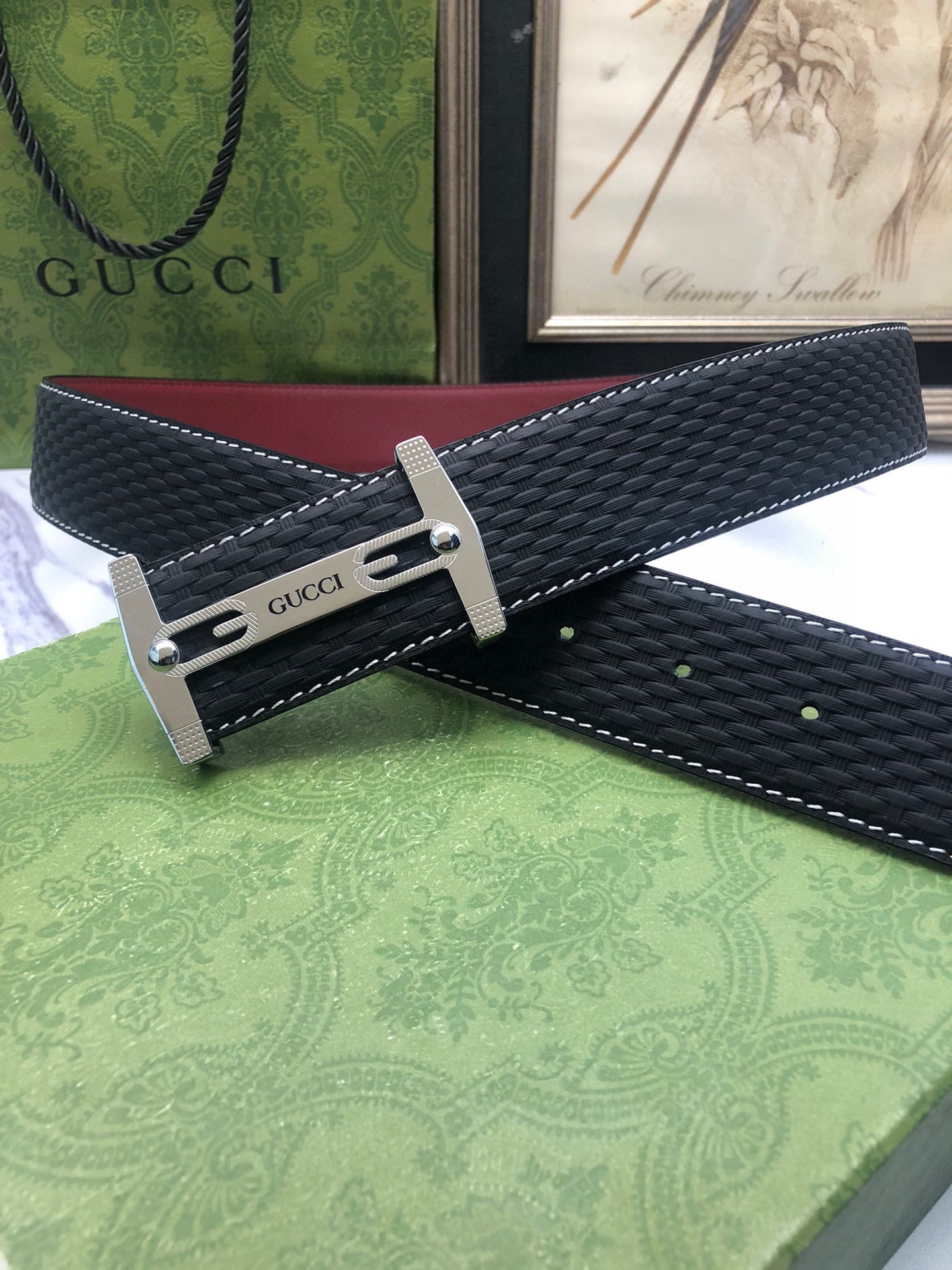 Gucci: Original single-grain calfskin with embossed patterns, lined with plain cowhide base, creating a woven appearance. Decorated with the original single buckle of the logo. The counter width is 4.0