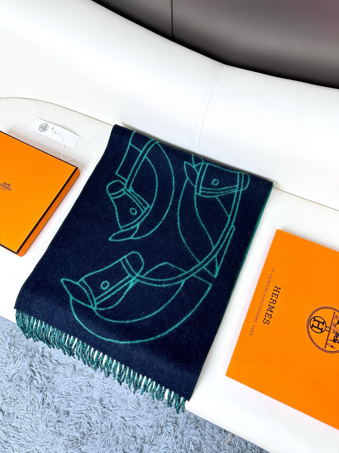 This new Hermes scarf features a delicate color-blocking jacquard weaving, presenting the Entrelacs Equestres horse head pattern designed by Geoff McFetridge. The size is 40*195CM