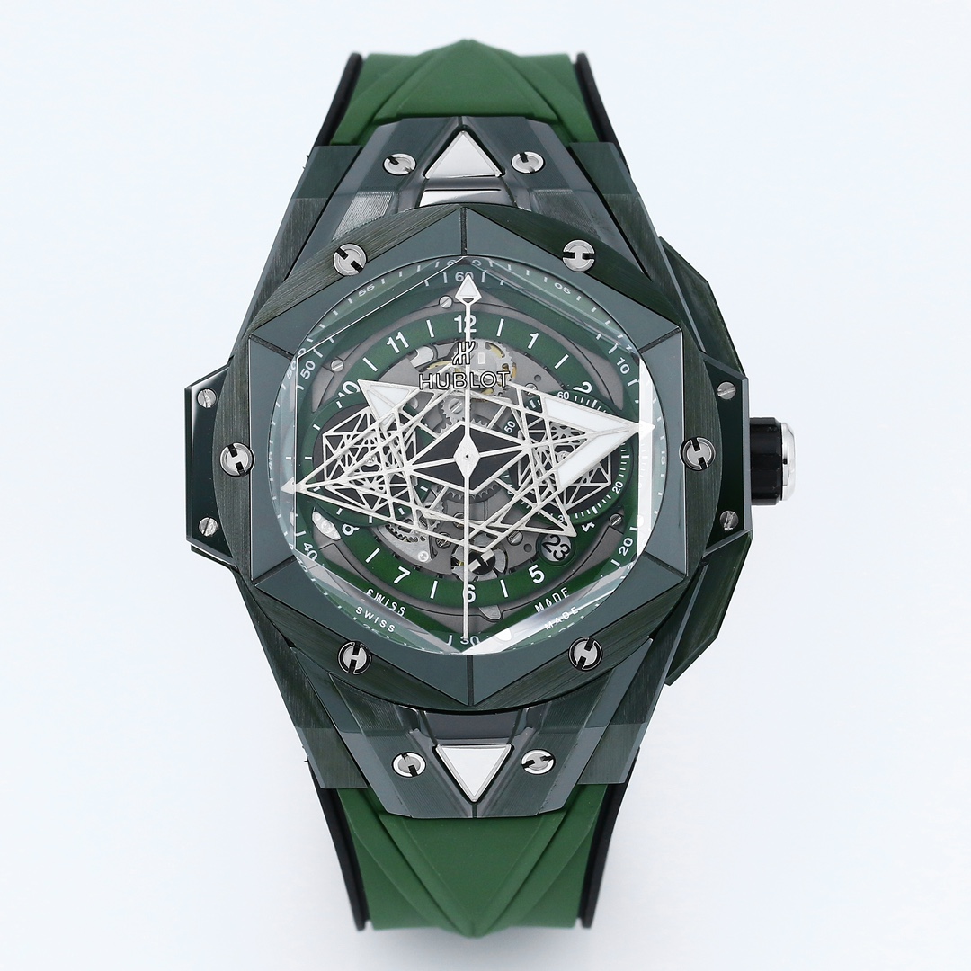 ?? HUBLOT ??HB3 Big Bang Sang Bleu II tattooed second generation watch. By using three-dimensional geometric figures and ingenious conception, it presents exquisite relief effects and a perfect three-dimensional visual experience. The ceramic case adopts a unique high-temperature and high-pressure forging method to form ultra-high-density colored ceramics. After being carefully selected from a hundred, it is ensured that each finished product has no color difference from the original, achieving true consistency with the original! After polishing, satin finishing, slicing, engraving, chamfering and face-cutting, it presents an alternating and superimposed hexagonal spatial visual, perfectly interpreting the brand's ambition and design concept! ?? The most eye-catching diamond-shaped hour and minute hands and the two hexagonal sub-dials on the left and right show a different geometric pattern visual effect as time goes by. The overall geometric patterns on the dial have been polished to a CNC-level level to give a sharp visual effect, with no burrs at all from any Angle, every detail in one go. The imported fluororubber watch strap, paired with Hublot's easy-to-use folding clasp, makes the wearer more comfortable. The movement adopts the 7750 modified HUB1240 movement. Even if the case back is transparent, it can still be flawless. After precise polishing, the stability of the 7750 base movement has been greatly enhanced, alleviating the long-standing awkward situation where chronograph movement models only have their own watches! Be flawless! OL has been meticulously crafted over a period of two years. Welcome all watch enthusiasts to appreciate it! Blue and grey CERAMIC models are being updated successively ??S1 exquisite recommendation men multi-functional mechanical watch