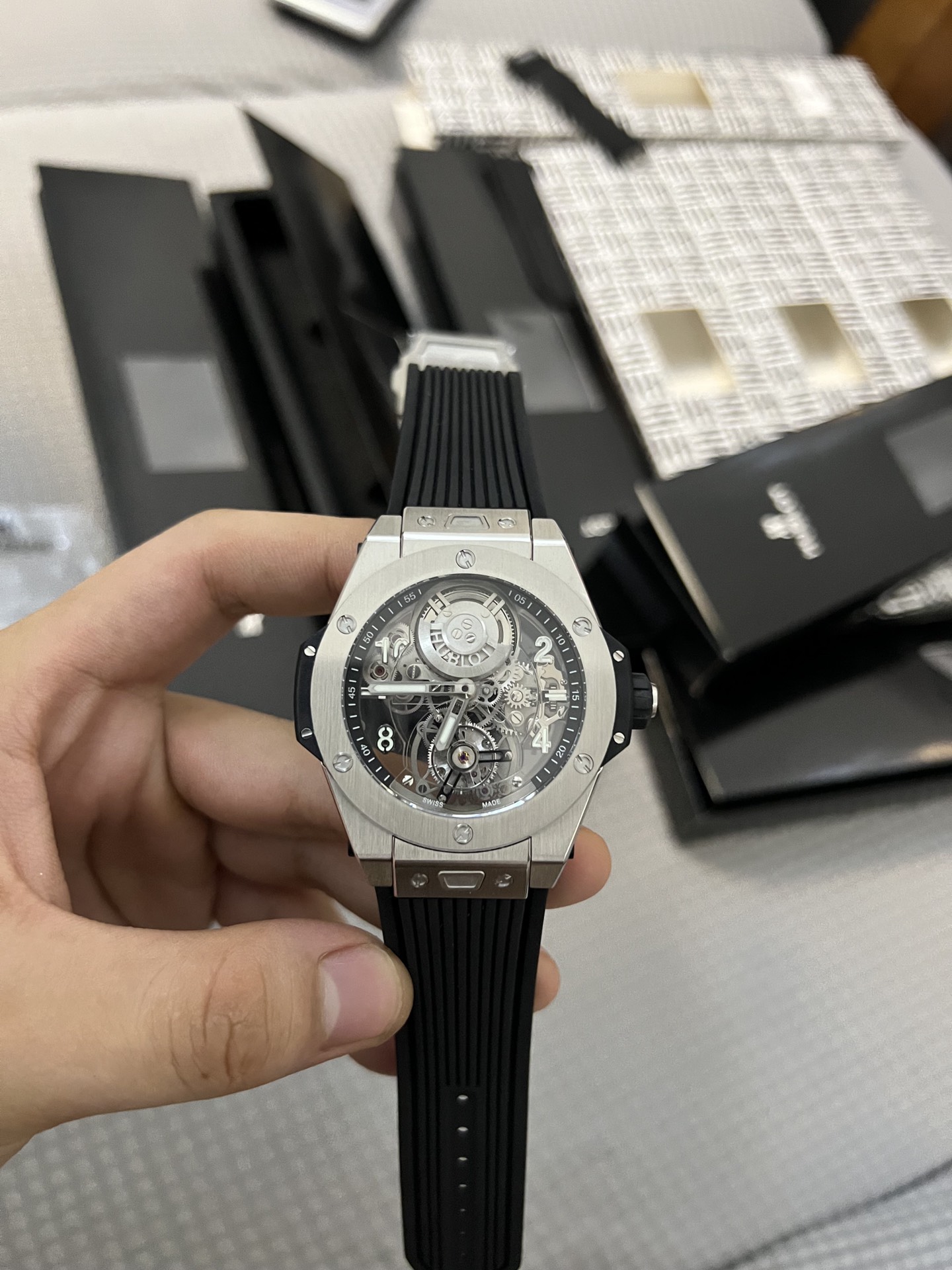 Hublot (Hengbao) BIG BANG Unico Big Bang Series Tourbillon Exclusive Debut! Breaking through previous works, it is the first in the market to feature a crystal bridge inside the watch head, equipped with a tourbillon, and the movement is a complete replica of the genuine product. It adopts the original HUB6035 movement integrated machine independently developed by a foreign listed watch company for over 13 months, with no return repairs upon leaving the factory The rim opening is made of original piano black ceramic material The highest degree of restoration! Three reasons to purchase: 1. The case shape and size are exactly the same as the original. It is the first crystal integrated tourbillon in the market. The case diameter is 45mm and the thickness is 15.30mm. The case shape looks exactly the same as the original from all angles. 2. The movement is stable and has a high degree of restoration. Integrated HUB6035 manual winding tourbillon movement, over 98% close to the original structure, all gears for genuine transmission without decoration, 72-hour battery life, accurate 5