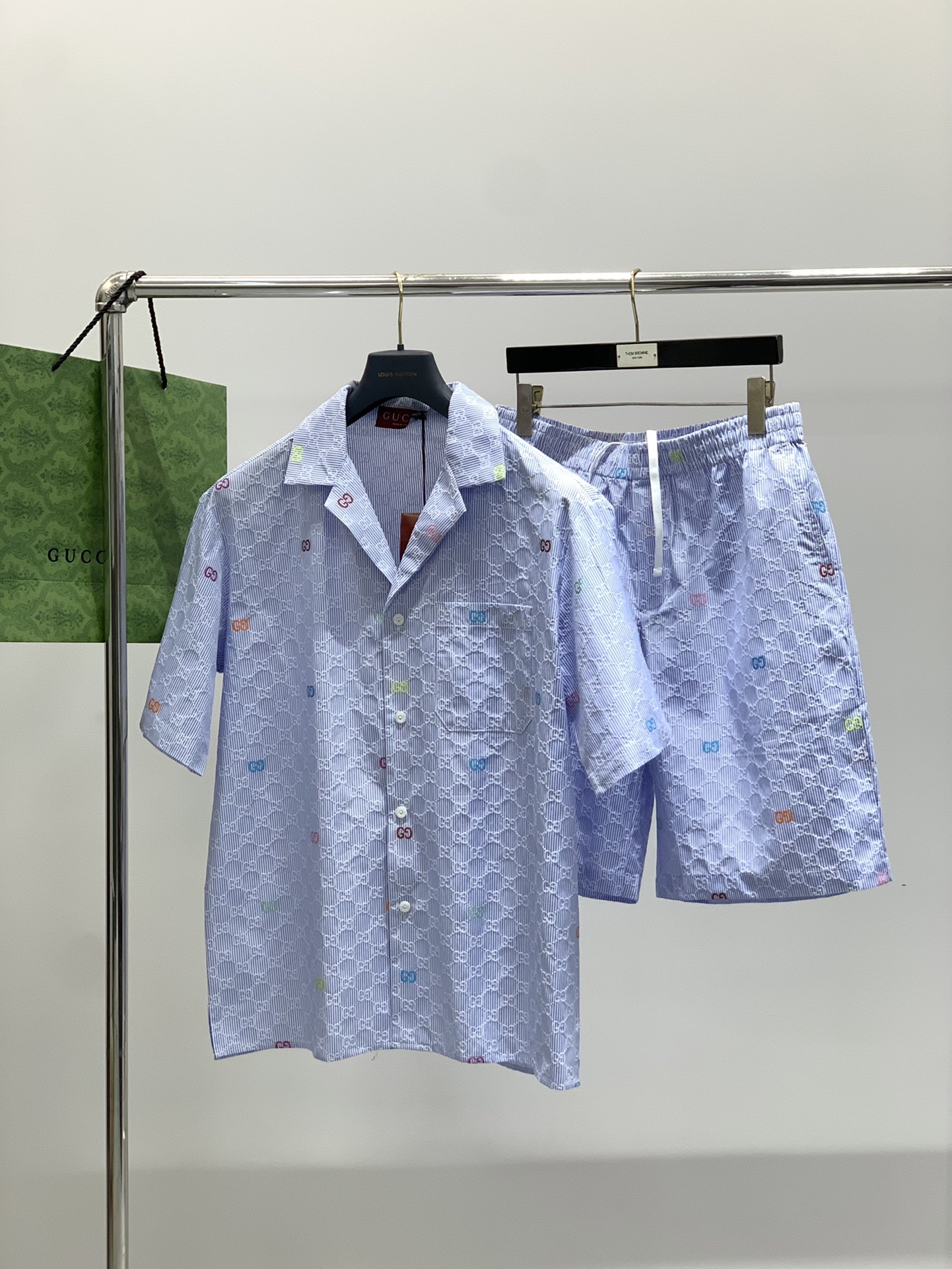 Clothes, shorts, Gucci, the latest summer 2025 collection, available simultaneously at the counter. Original single essentials, fashionable casual sets, very distinctive when worn! Eye-catching and with highlights, made of imported original fabric, decorated with top-quality jacquard lettered patterns and logos, decorated with original hardware accessories, simple yet fashionable, classic and elegant, comfortable and breathable, looking cool and stylish when worn. Size: S-XL Sizes: S, M, L, XL Garment length: 73.5 75 76.5 78 Chest measurements: 114 118 122 126 Shoulder width: 50 52 54 56 Hem 114 118 122 126 S M L XL Side length: 53 53.5 54 54.5 Waist circumference: 78, 82, 86, 90 Seat size: 108 112 116 120 Toe 64 66 68 70