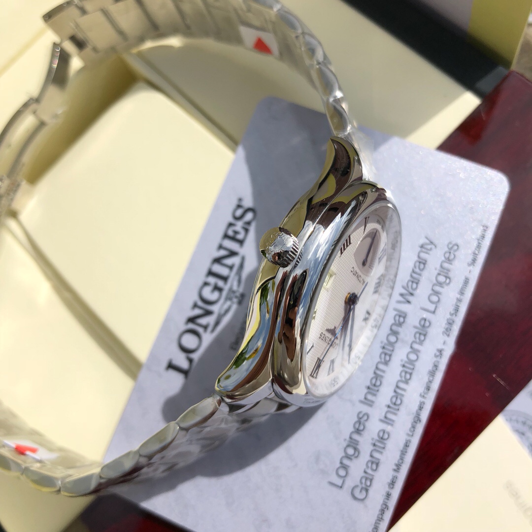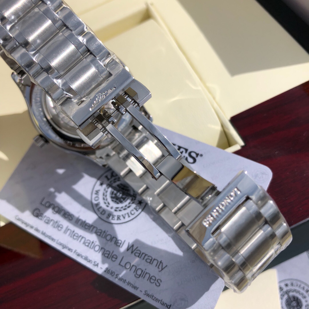 The Longines Master collection of men's mechanical watches is the best symbol of noble elegance and exquisite craftsmanship. It features an automatic mechanical movement that offers a 42-hour power reserve. Functions include hour and minute display, a central seconds hand, a power reserve indicator at 6 o 'clock, and a date window at 3 o 'clock. Dial: Silver polished "grain" pattern, 11 black Arabic numeral hour markers, blue steel hands. Case: Round stainless steel case, scratch-resistant sapphire crystal mirror, transparent sapphire crystal caseback. Diameter: 38.50 millimeters. The waterproof depth is 30 meters. Watch band: Stainless steel watch band